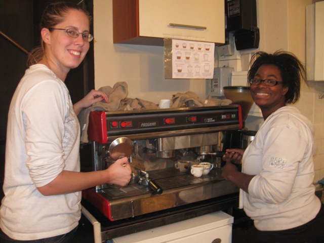 Me and Becca as baristas making Kava S Mlijekon (Coffee with Milk) in Croatia