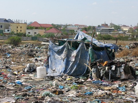 I do not sleep under the tarp I call home because other people who live on Rubbish Mountain have threatened my life for giving good advice to foreigners. I tell foreigners to be careful, watch your belongings carefully and do not travel by yourself. My own people have threatened my life so my friends and I sleep on or near the road the trash trucks travel to dump the trash.