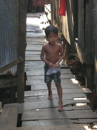Meet Srey Lak Keoun. She is 5 years old. She lives in a one-room shack in a village in the slums. The village is built over a sewage marsh. Altogether, Srey Lak has four brothers and two sisters. Her father used to drink a lot and he and Srey Lak’s mother were always fighting. Three of Srey Lak’s older siblings left home to get away from the fighting. But Srey Lak’s father recently went to prison for rape, and one of her older brothers has returned home to help support their mother. The family earns money by sorting through sewage and collecting recycling.