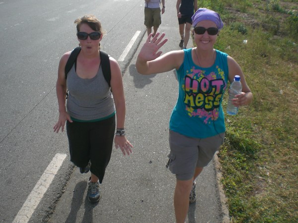 Holding up 8 fingers, to declare 8 straight hours of walking            Been going for 10 hours, trying to keep our smiles!