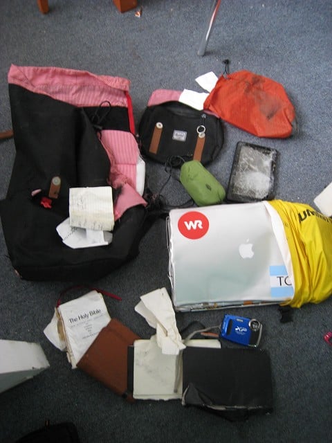 As we scrambled to collect the scattered belongings, Heith and I enjoyed telling jokes and laughing about what had just happened. Among the debris was my first Macbook, Kindle and camera, all of which were gifts I had been given for the Race. (Others included my Bible, journal, sleeping pad, some clothes, and other random tidbits – the necessities survived!) I felt like I needed to be upset, as if I wasn't responding properly to the situation; nothing but positive thoughts flooded my mind and I couldn't quite understand why.