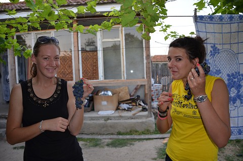 Saturday morning we went to Alex's in-law's house and moved wood.  Most Romanian families use wood stoves to heat during the winter, so we moved the wood from the yard where it had been split into the shed in preparation for winter.  They then fed us more Romanian barbecue.  We loved the influx of meat into our diet as our food budget makes meat a rare commodity.  They also have grape vines strung around their house so we got to eat grapes right off the vine.  Raspberries in Serbia, grapes in Romania.  We are spoiled.