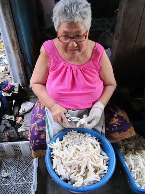 Yes these women are deboning chicken feet.  There are a lot of footless chickens. Yes, I have tried chicken feet in Thailand.  Not a favorite.