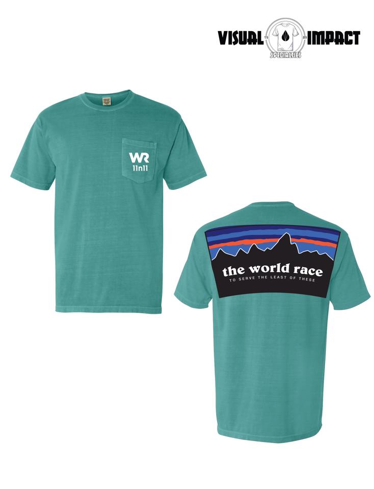This Patagonia-esque styled t-shirt is on Comfort Colors brand in sea foam. Even though the print on the back appears curved in the proof, it will be squared off on the actual shirt. 🙂