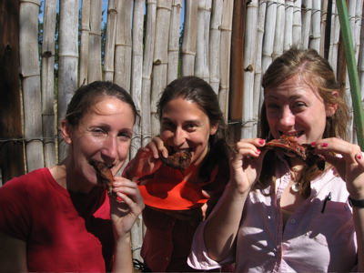 While waiting for the meat to arrive, we began to gather wood to make a second fire to cook the meat. That’s when our friend and local contact Nicolas showed up with the meat (today’s special – warthog, a local delicacy, it tastes like pork). He helped us build the fire, telling us to let the blaze burn down before cooking the warthog. So we waited until what seemed to be “the final hour.” Just minutes before noon, Katey and Sarah put the warthog on the fire. I was back in the schoolroom teaching.