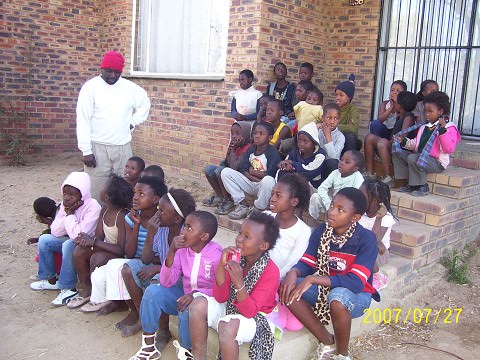After a few weeks of working out all the details, we were finally able to deliver the finished product. (YEAH! – the fun part.) When we arrived, all the kids were waiting politely for us, sitting on stairs outside the community center on the outskirts of Joe Slovo. As the team leader and project point person, I was ushered up to the front to give a little talk, letting the children know what they were about to receive and where the funds came from. I reminded them what we learned about at children’s camp the prior month – that God’s love is powerful, God’s love saves, God’s love protects, and—most relevant to this situation—God’s love provides.