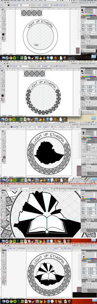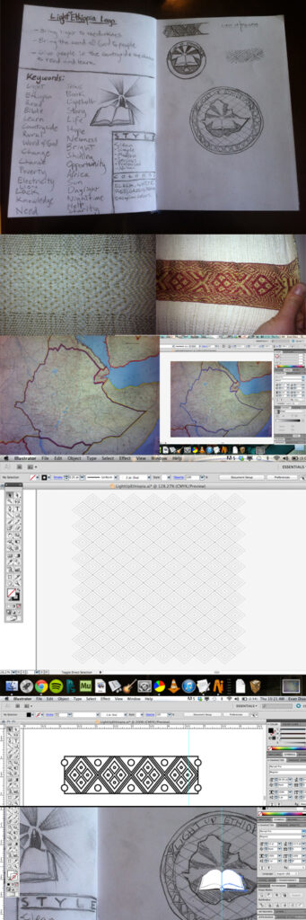 Month 3 we were in Ethiopia, with a ministry called Win Souls For God, and our contact’s name was Mickey. Mickey had a vision to make an organization called Light Ethiopia, which would give battery powered book lights and house lights to people in the rural areas of Ethiopia which have no electricity. He was very passionate about this vision, and wanted so badly to bring light into this extremely dark place. So I went all out. I did research, did concept development, found some Ethiopian style patterns, did a few sketches, and came up with an idea I decided to use as the final design.