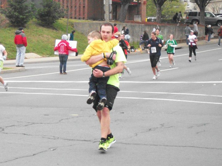 One of the ways I felt God helping me get through this marathon was my family and some of the greatest friends I have ever had the honor knowing! That picture is me at the half way point of the marathon. Tristan ran out and gave me a big hug, and I was greeted by cheers from my mom, my cousin Drew, and my AMAZING friends! It was just the encouragement I needed, feeling so hurt and limping, trying to compensate for the knee pain. I told Tristan I had to keep going. He asked me, “Why?” I told him, “Cause I need to finish the race.” I put him down and continued running. I got about 500 yards down the road, I saw the “26 mile” painted on the road facing the other direction, as we would make a big loop and come right back this way.