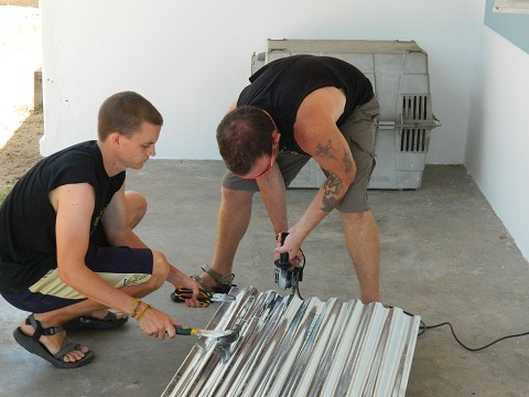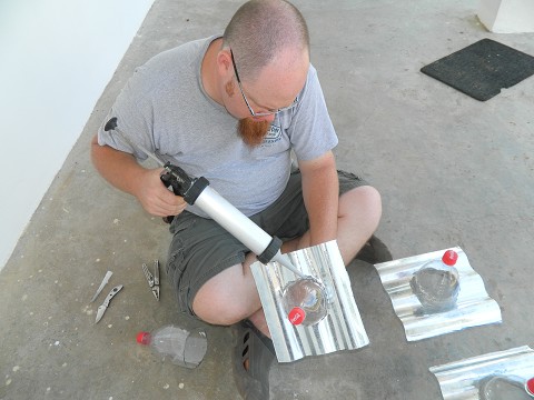 To contruct the lights, first we had to take metal roofing and cut in in to squares. After we cut the metal in to squares, we had to cut a hole in the middle of it a little smaller in circumfrence than a 2 liter coke bottle. From there, we peeled some of the metal back, so then the next step was to take a two liter Coke bottle and make sure the folded metal pieces held the bottle tightly. Then we sealed it so no rain could leak through. Then, fill the Coke bottles with water and bleach and then we were ready to install them.