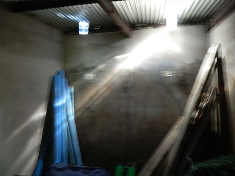 After we had finished making the solar lights, we went over to the farm to install them. When we got there, we had to cut a hole in the roof of the room for the Coke bottle to slide down in to the room. Then we put the coke bottle through the roof, and then with the metal piece attached to the Coke bottle, we sealed it with the roof so no leaking would get in. And here are the pictures of the before and after results of the solar lights. Its so cool when Father allows you to bring physical light to the world while bringing Spiritual light as well. Oh, how He is big!