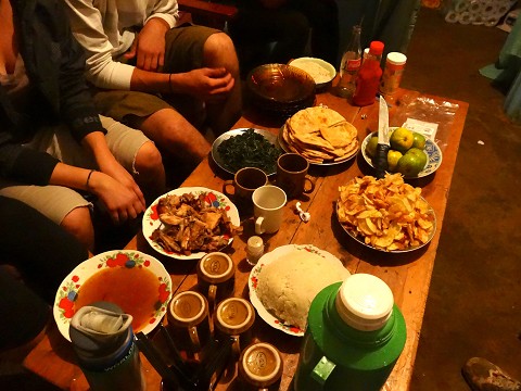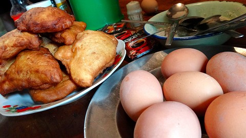 7:30am: Breakfast. Usually boiled eggs, and fried bread. Instant coffee is a given. Occasionally some very large and delicious avocados.