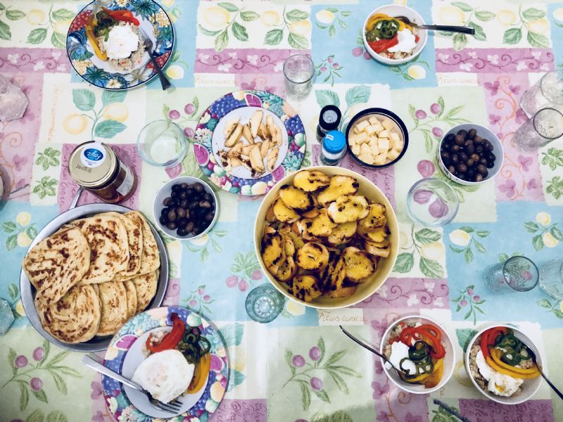 After the initial shock, it was go-time. “OK. What do we have? Olives… eggs… bread… cheese… rice… couscous…lentils… peppers… yogurt??”