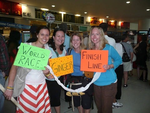 Finish Line at JFK. Once a precious comodity, toilet paper became the finish line. Rachel, Theresa and Sara welcome me home!