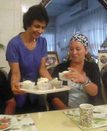 (Left: Lisa serving Alex ice cream at tea. We quickly learned “tea” was more than just tea, but a full meal.)