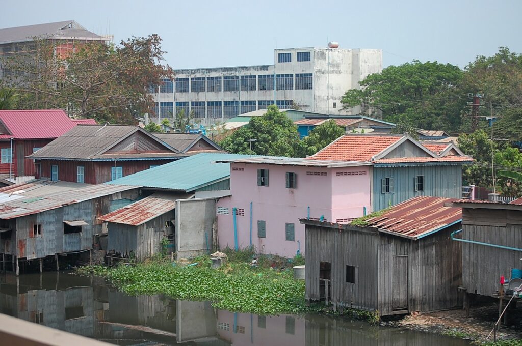 scattered with tin shacks up on stilts and children playing around outside instead
