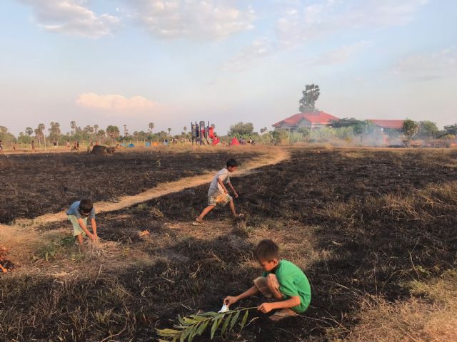 4) To cut the grass at the orphanage, the kids light it all on fire and then stomp it out with large green branches from the mango trees.