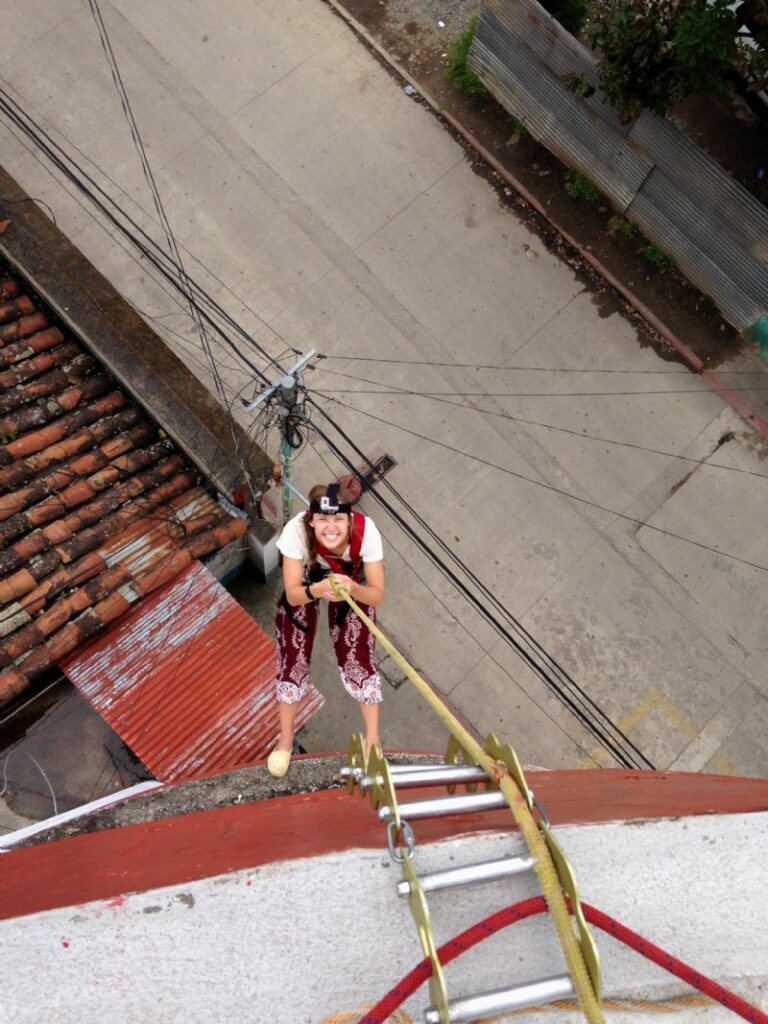 Today we helped at the fire department because they needed us to paint. They failed to mention that we would be hanging from ropes. Yes, we are figuring all this out with the google translator on the volunteer’s laptop sittin on the bumper of the fire truck. So they broke out the harnesses and carabeaners and I strapped the GoPro to my head and down we went from the roof of the 3 story building. {Thankful I semi-paid attention to the very important knots this summer during rock climbin 101…}