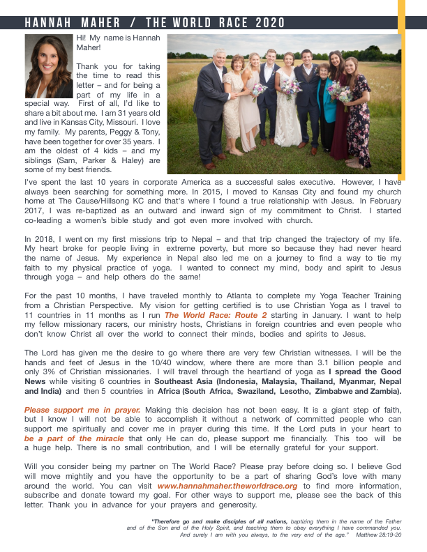 Friends & Family – This is a letter to share a bit about what I am doing, where I am going and why I am going on The World Race. I would love it if you joined me on my journey by following my blog!
