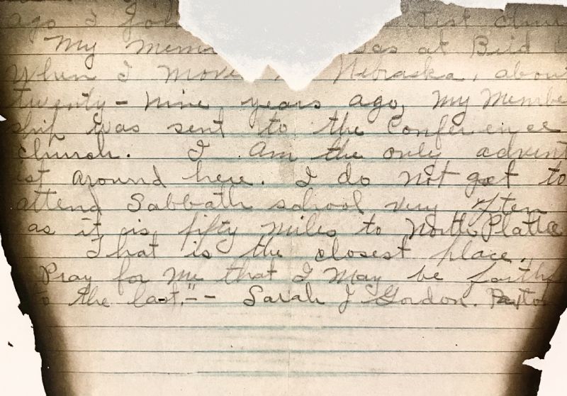 When I moved to Nebraska, about twenty-nine years ago…was sent to the Conference church. I am the only Adventist around here. I do not go to attend Sabbath school very often as it is fifty miles to North Platte.