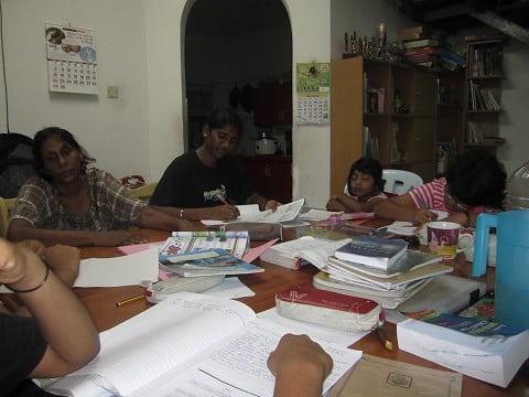 These are Sharon, Catherine, Angeline, Jaqueline and Reetha. Every night, we write essays, practice multiplication tables, and read stories. In the afternoon, we go to the park or play board games if it’s raining.