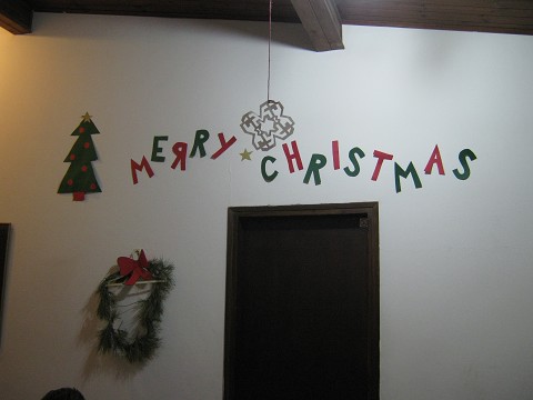 over for Casey on the ladder hanging up pine cones and snow flakes.