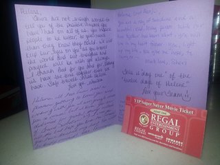 August 16th is my last day at RMHP, which is in 12 working days. This pass month has been very hard because I fell in love with the RMHP family. Today my boss and co-workers walk in my office and handed me a card. I told them that I didn't want to read it in front of them because I would start crying. While opening the card a movie ticket fell out (I am a movie addict). So, my boss said just read this part then: This is "day one" of the "twelve days of Helene." Love your team.