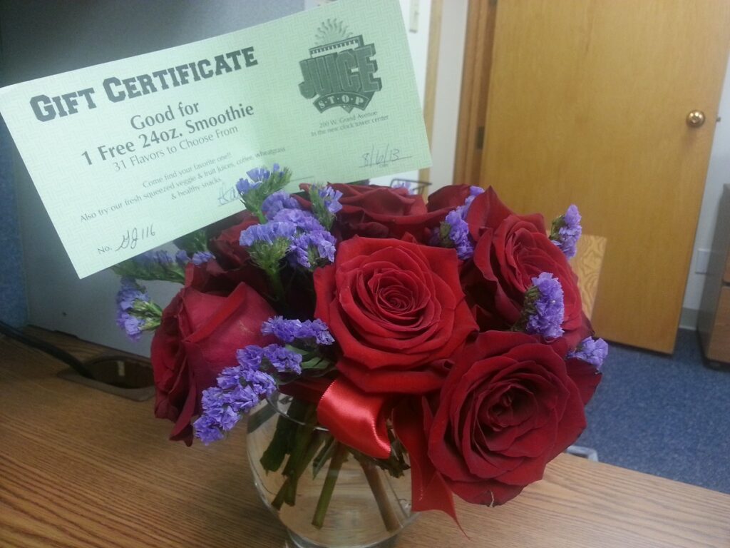 I received a beautiful bouquet of red roses and a gift certificate to Juice Stop (one of the best smoothie place in town). My co-worker Carrieann took me to Juice Stop a few months back and I had the most unbelievable mango, strawberry, pineapple and peach smoothie. Thank you guys so much for the beautiful flowers and smoothie. There is no telling what is going to be next.