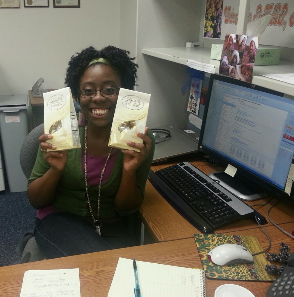 Microsoft Outlook was not my friend today and almost brought me to tears. Outlook decided not to send my meeting requests, delete my meeting and then post the famous warning "Operation Failed". My co-workers came to my rescue and Sheri handed me TWO bags of white chocolate which put a huge smile on my face. I had one of the bags open before the picture was taken. Thank you Sheri, Beth, Monika and Carrieann!!