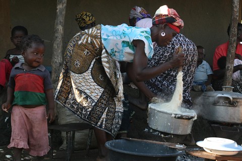We were later welcomed in to the pastor’s home and given a bowl to rinse our hands in for the meal.  We sat in a dark room made impressively of mud walls and a grass roof.  Eating with our hands, many enjoyed their first taste of sheema, which tastes vaguely like plain Cream of Wheat that has been condensed and cooled.  It is the main food supplement in Mozambique (along with most of Sub-Saharan Africa) and is made solely from flour, water and hours of churning.