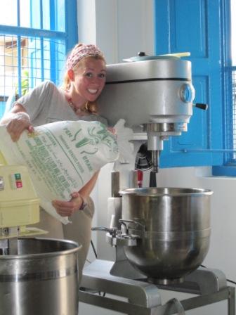 The trainees spend 18 months training in the bakery. They are provided a place to stay and a small wage, and are expected to stay off drugs. If they can save a little bit of their pay during the program, a partner bank will match their savings. They can also get assistance in getting a job or starting a small business upon completion of the program. The trainees acted as our gurus (or teachers) today in the bakery. I made little pizzas with veggies and sausage and helped package the baked goods once they were finished. We had so much fun talking broken English with the trainees and singing songs on the radio.