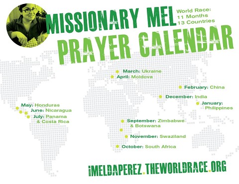 Here is my prayer calendar on the map. Be sure to check in by reading my blog, making comments & sending me love notes and prayers by clicking here.