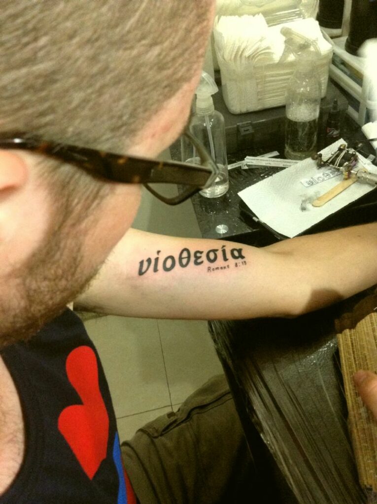 represents. It is the word Adoption written in Greek with Romans 8:15 just under. It is a