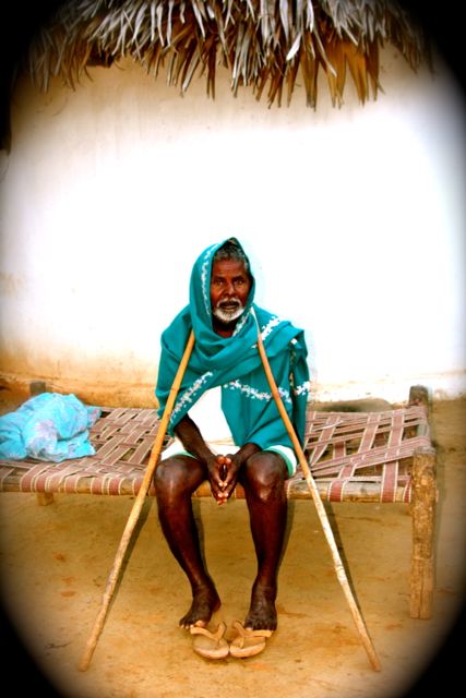 When we arrived at his hut, he could not stand up straight and could not walk without the aid of home-made crutches.