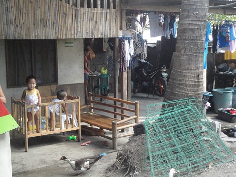 (Our yard, where another few families live, breed chickens and feed their young.)