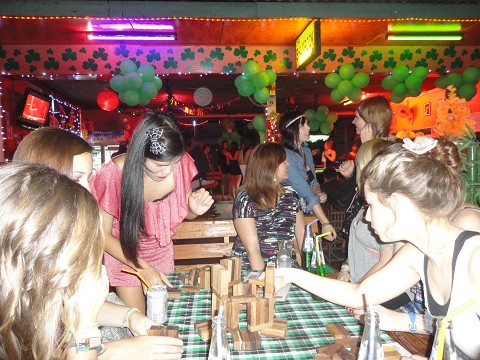 We play games on the table with the Thai women, Connect Four, a dice game that spells JACKPOT if you roll the right combination of dice and win, and Jenga,. These games are played with clients to "break the ice". As we play, we make small talk with one another, "You have such pretty hair." "Do you remember me from the other night?" "What, you forgot my name? The girls laugh and cover their mouths with their hands as they do, shoing their shy side. Then a popular dance song come on over the loud stereo system, and a couple of them let go of their Connect Four chips and stand up, and start move their bodies to the music, showing their grinding skills to onlookers, men of all ages walking by, window shopping.