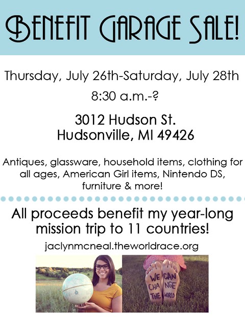 If you're unable to attend, please join me in praying God's blessings on this sale, my gracious friends & family who are helping make it possible, and those who stop by. I'm so excited for this awesome opportunity to raise money for my trip as well as minister to those who come! We know that God works for the good of those who love Him and I'm trusting that HE WILL PROVIDE.