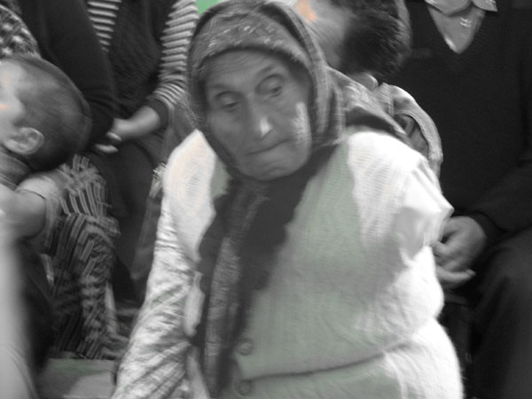 Then she gingerly sat down next me. She only had about three teeth left and she was stooped over with a large hunch on her back. She only had one arm and she wore a scarf on her head with a long dress in muted colors.