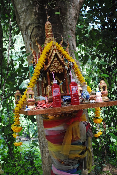 - The main religion is Buddhism and as a result you see shrines to pagan gods everywhere you turn. Here’s an example of one of the shrines. People come and leave offerings for their gods. Any offering is accepted, even an open soda as pictured here; straw included.