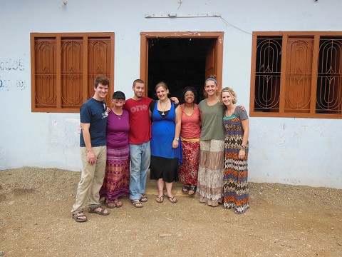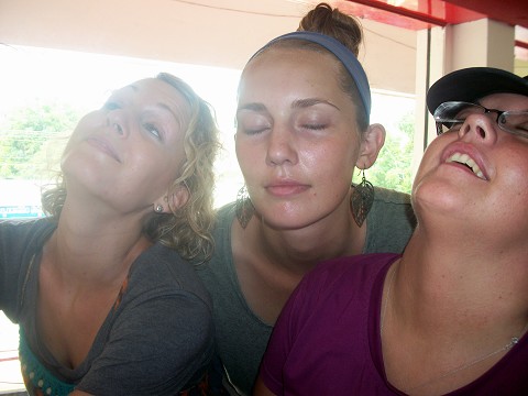 Watching a movie consists of seven people laying on sleeping pads in front of a laptop with only one ear phone working.