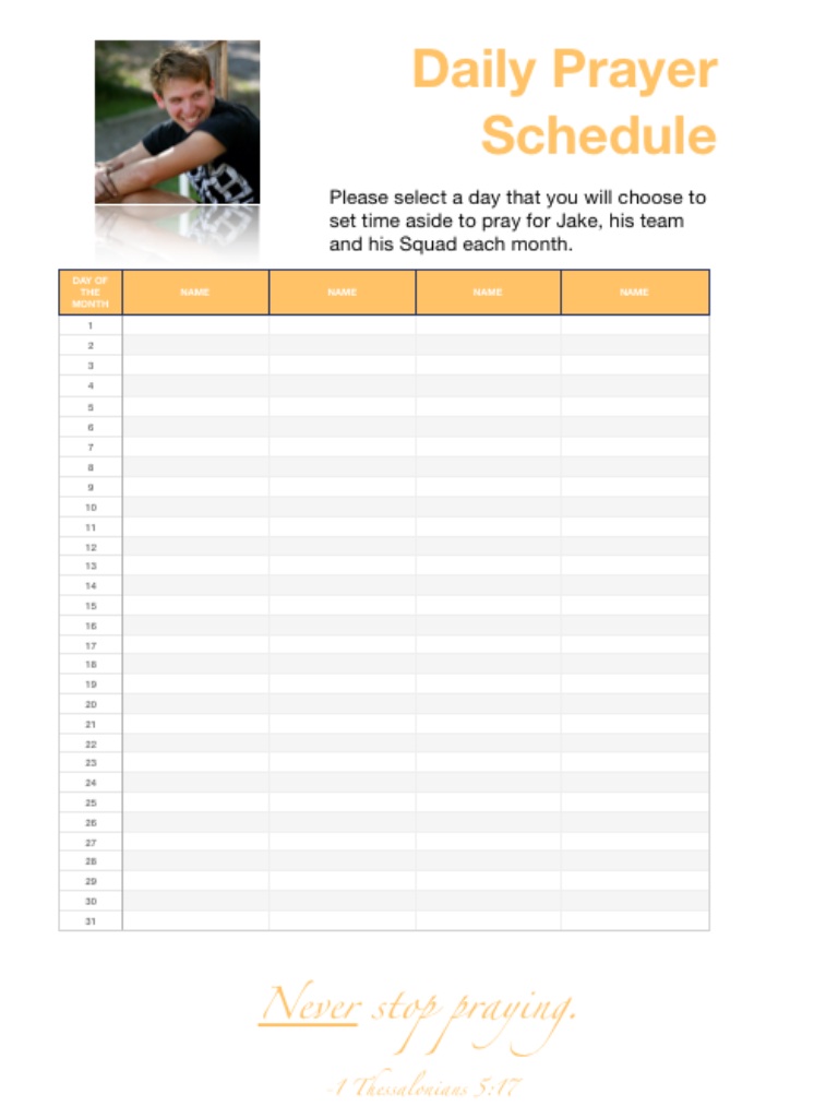 Now obviously you all have already blessed my socks off with financial support already. And I don’t doubt for one second that you guys are praying for me. But another one of my squad mates came up with a great idea of starting a list of prayer warriors that will choose to set aside some time one day each month to pray for me, my team, and my squad. I’m looking for people that aren’t just going to look at prayer as a last resort but they look at it as a weapon of power to use against the devil and his evil schemes!