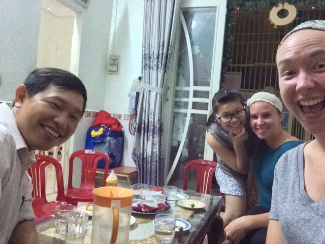 His wife made us a real Vietnamese meal consisting of fish, cabbage, an egg bake, squid and of course rice. We all sat around and talked about everything; how to pronounce “fork”, his job, family, the kids school and life in America. For someone who isn’t adventurous with food, it was the best meal I’ve had in Vietnam. In Vietnam it is rude to not eat all the food, so we ate, and ate…and ate. We were so stuffed by the end, but it was so good we couldn’t stop.
