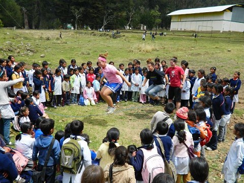 Bolivia: Going into Bolivia, we thought we were going to be working with orphanages. Well we were, just more of the financial or developmental side, which in simple terms meant- no children. During our manual labor time in the mountains all of a sudden, hundreds of kids just showed up at the construction site. Well, what do we do? Take a break and entertain them of course. Out came the jump rope and the gringos (white people) acted like little kids for awhile. This was definitely one of the most memorable times in Bolivia.