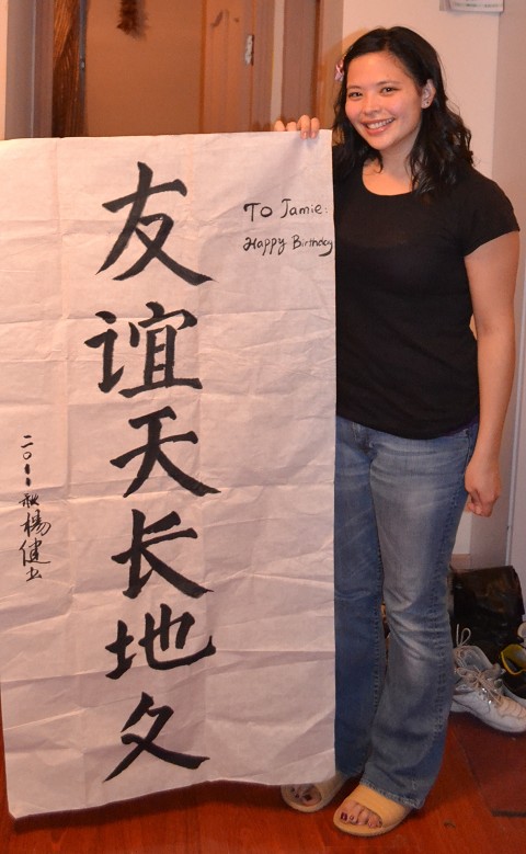 Devin painted me a banner in Chinese calligraphy that says “Friendship is forever.”