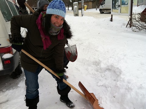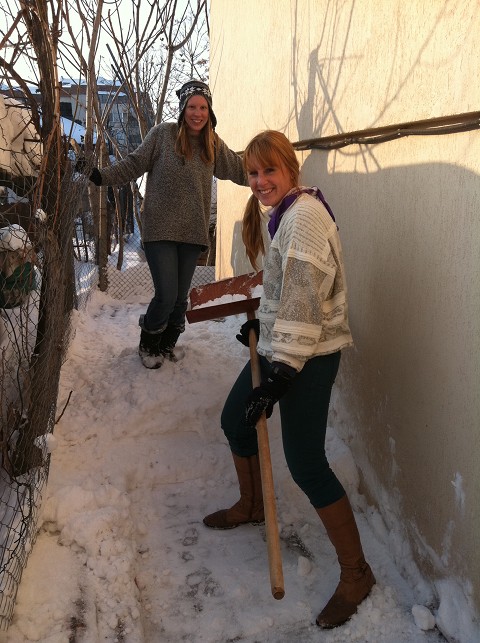 Megan and Kristen made a hilarious series of How-To videos during shoveling, which demonstrated each of their methods, again considering that they couldn't turn around to carry the snow out of the small alley we were working in. We would have to walk backwards with our shovel till we were out in the open.