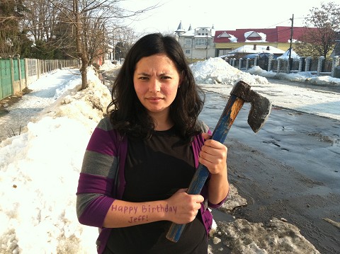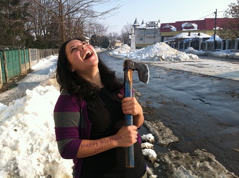 In fact, after even a few minutes of shoveling and working up a sweat, we found ourselves shedding our coats. Here, Maria is standing in a 3 inch hole that we made by taking an ax to the solid ice!