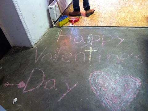 To add to that, Peter and David surprised all the girls on Valentine’s Day by cooking us breakfast in the morning, chalking Happy Valentine’s Day on the ground entering the room. Then, cooked a WONDERFUL dinner with breaded snitel pork steaks with homemade apple sauce, broiled salmon with cherry sauce, scalloped potatoes, and seasoned steamed carrot sticks. It was a really loving and wonderful Valentine’s Day, and for some, a really redemptive day, which makes my heart sigh. I, myself, have no bitter feelings toward Valentine’s Day, but it soothes my soul to know that this year we had such men of God to redeem the past hurts of these daughters of God that I love so.