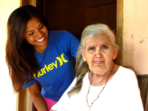 Denise bringing some laughter to a grouchy grandma at an old peoples home!