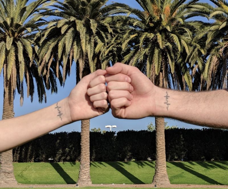 Our tattoo: a heart beat line with waves. First, we have saltwater hearts- we grew up at the beach. One hour standing in those waves hits the reset button for our souls. It’s in our blood. Second, it’s our reminder as we have struggled with anxiety that the God who created our hearts can calm the stormy waves of the sea and the rate of our heartbeat. So thankful I carry this reminder with me while on the race, but also a tie back to my little brother’s hip 😉