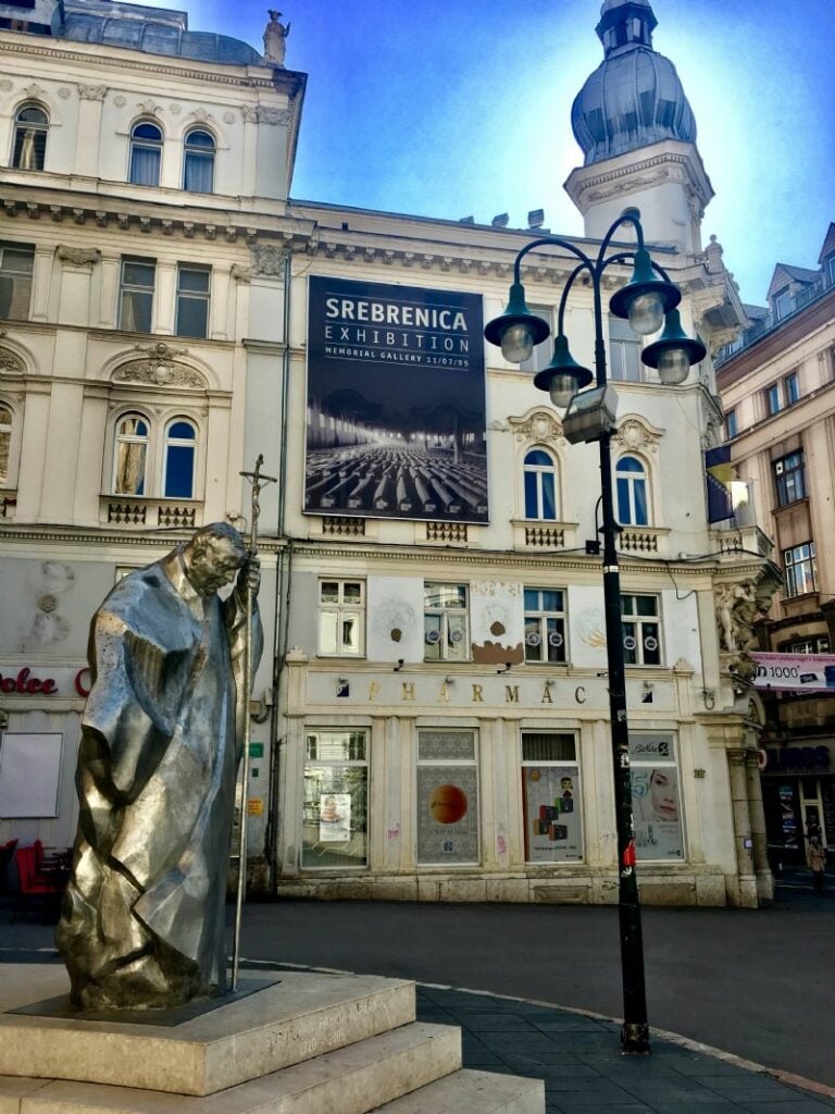 In downtown Sarajevo a statue dedicated to Pope John Paul II stands in front of an advertisement for a museum dedicated to the Srebrenica Massacre, demonstrating Sarajevo’s contrasting religious and cultural influences