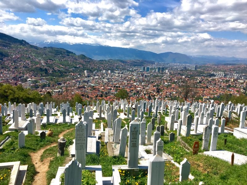 On the outskirts of town, a graveyard containing casualties of the Bosnian War overlooks Sarajevo’s downtown and residential neighborhoods